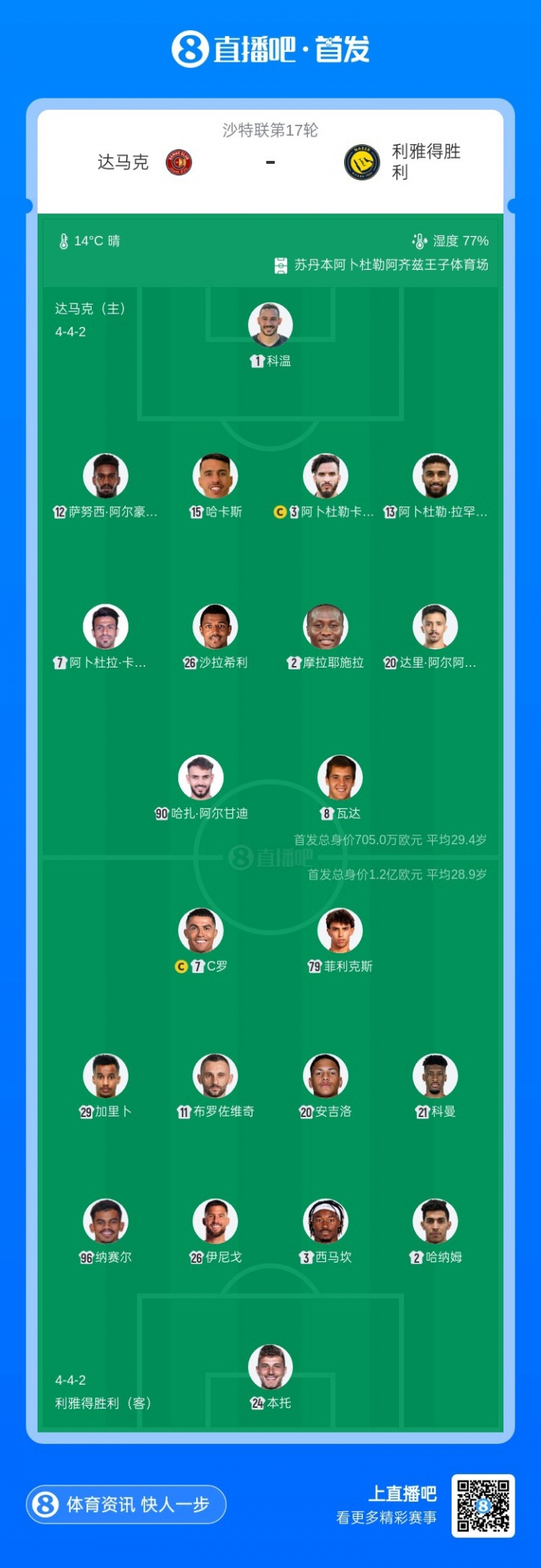 1月22日讯 沙特联第17轮,利雅得胜利客战达马克,赛前双方首发公布。
